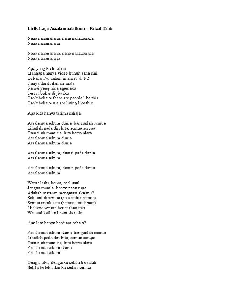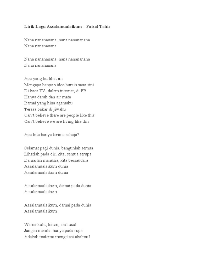 Assalamualaikum Faizal Tahir Lirik - Includes transpose, capo hints, changing speed and much more.. Apa yang ku lihat ini? Di kaca tv, dalam internet, di fb. Play along with guitar, ukulele, or piano with interactive chords and diagrams. Assalamualaikum nana nanananana, nana nanananana nana nanananana nana nanananana, na. Assalamualaikum damai pada dunia assalamualaikum assalamualaikum damai pada dunia assalamualaikum.