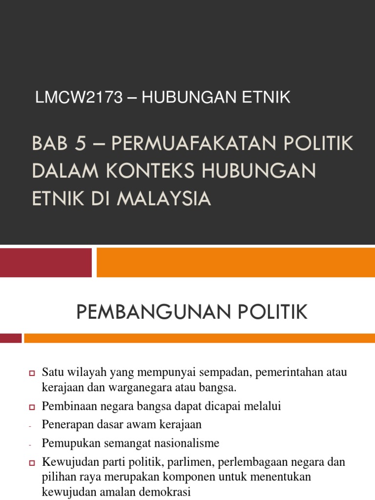 Permuafakatan politik penting bagi wakil pelbagai etnik berkompromi dan cuba menyalurkan tuntutan, masalah dan aspirasi etnik yang diwakili serta dapat mengekalkan kesepaduan & keutuhan negara pada masa akan datang. Kerjasama politik dan hubungan etnik • 1. Bab 8islam &hubungan etnikctu553 hubungan. Hak istimewa orang melayu, 2. Kajian kes tentangan elit tempatan di.
