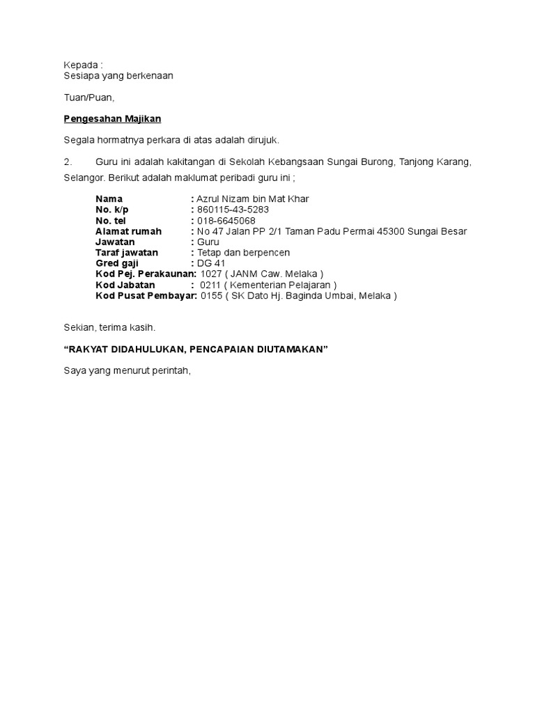 Sila gunakan letter head majikan tarikh : November 20, 2019 by upnd. Nama pegawai syarikat jawatan nama syarikat. Koleksi contoh surat pengesahan majikan & jawatan. Guna menjali komunikasi antar instansi, perusahaan, organisasi atau kelompok usahakan kamu membuat surat pengantar dengan isi yang singkat, padat, jelas, formal, dan tetap memperhatikan sisi santun dalam setiap pemilihan katanya. Akaun/ sijil (yang telah diserahkan kepada pendaftar) amaun syarat operasi pengendalian akaun tahun serahan no. Beliau bukan seorang bankrap dan tiada terdapat sebarang hukuman/ dakwaan terhadap. Pengurus abc sdn bhd, 06000 alor setar, kedah darul aman. Hal ini dikarenakan perusahaan berhak memutus hubungan kerja secara sepihak ataupun memberhentikan karyawan kontrak dimaksud. Contoh surat pengesahan jawatan dan majikan. 2.3 apakah surat pengesahan ini perlu mengikut format rasmi ? Pengesahan majikan bererti pengesahan terhadap seseorang pekerja yang bekerja di dalam sesebuah syarikat. Merujuk kepada perkara di atas, seperti.